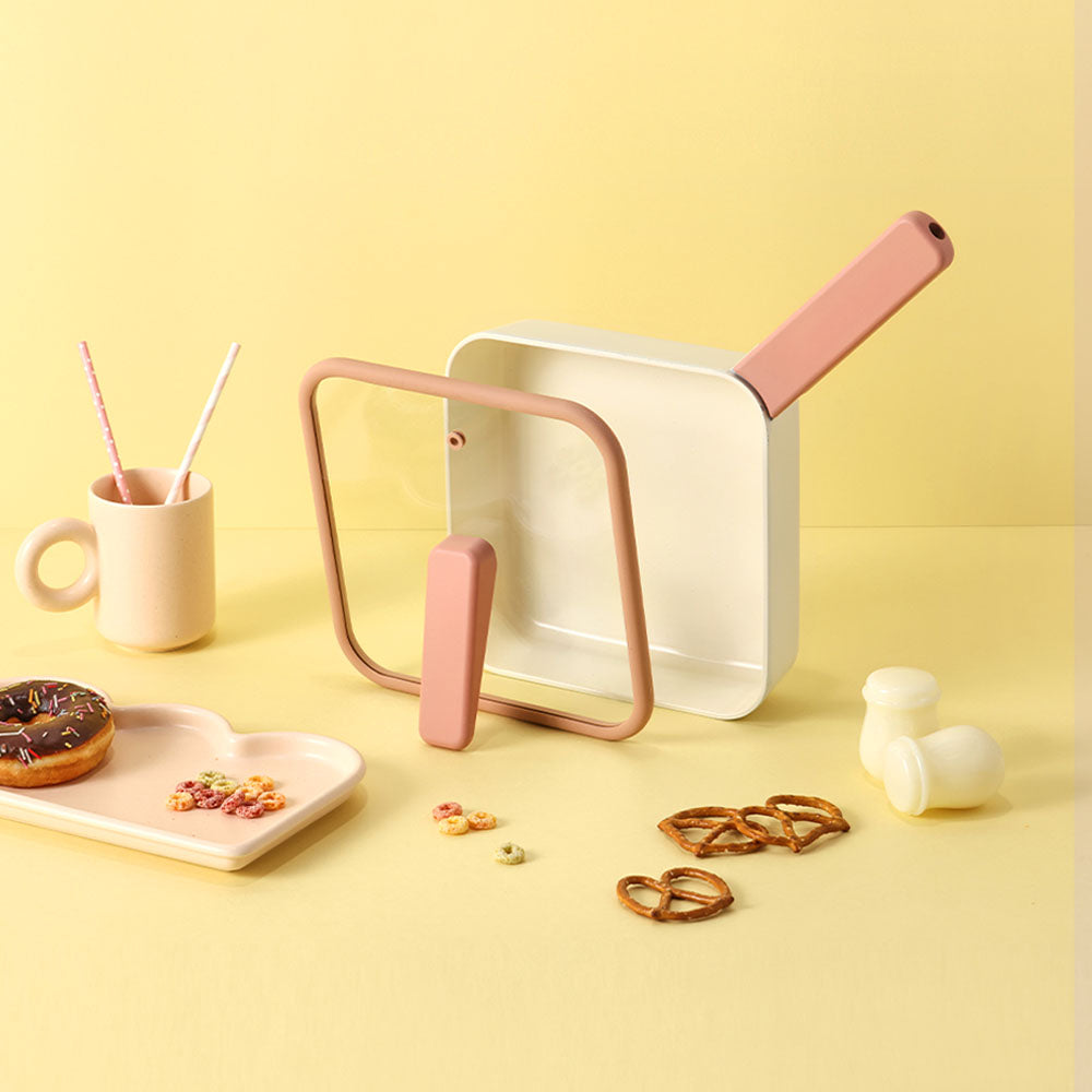 The versatile square multipan offers a wide cooking surface with a deeper design, perfect for everything from sautéing to simmering. Both the body and the lovely pink lid stand upright, helping save space and keep your kitchen organized. Prop the lid while cooking to prevent it from sliding and reduce heat contact.